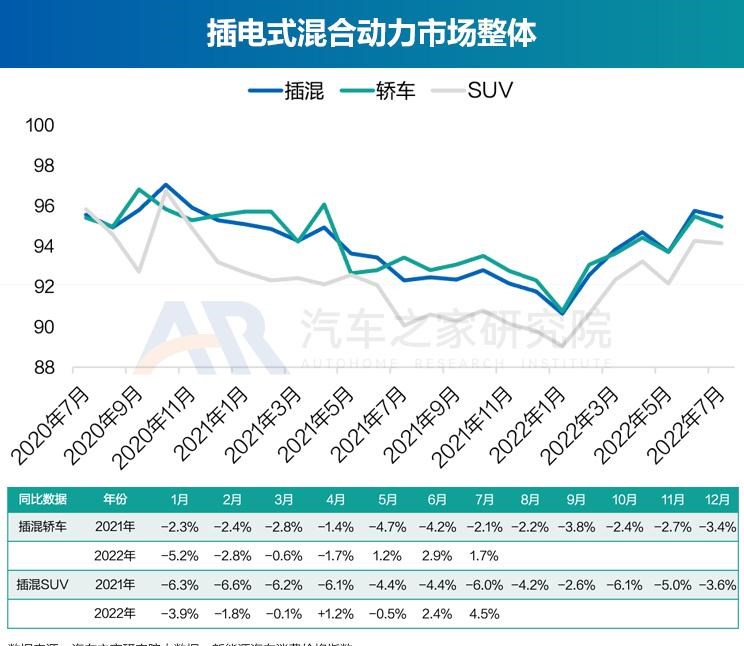 插混轿车市场的价格指数为94.98,同比上涨1.65%,环比下降0.53%;细分市场整体均价为19.73万元,较去年同期跌2100元,较上月涨1.11万元。插混SUV市场的价格指数为94.13,同比上涨4.50%,环比下降0.16%,细分市场整体均价为20.34万元,较去年同期跌5.18万元,较上月跌5600元。