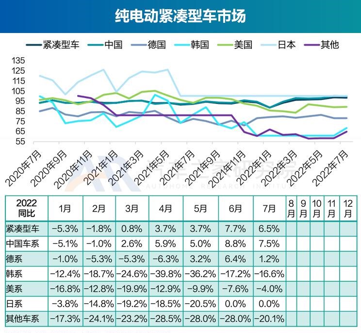 7月,纯电动紧凑型轿车市场的价格指数为98.22,同比上涨6.49%,环比下降0.47%。分国别看,除日系持平外,仅中国车系(-0.6%)下跌,韩系(+12.2%)、其他车系(+11.0%)、美系(+0.6%)、德系(+0.2%)均上涨。