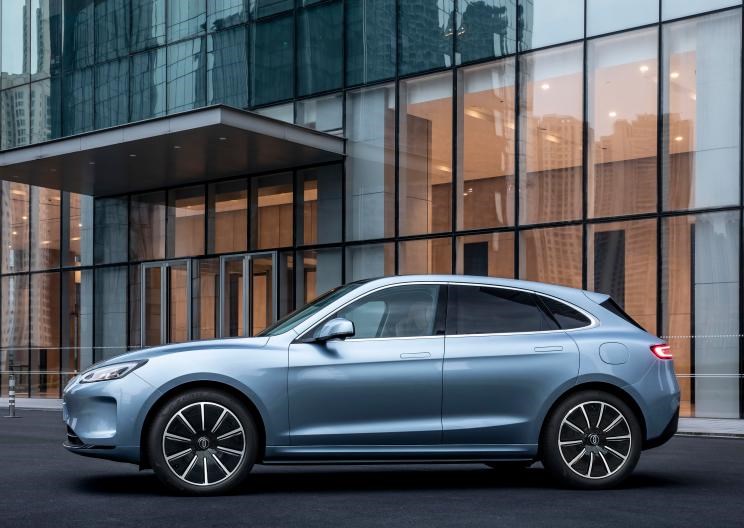 车身侧面造型流畅,平直的上腰线搭配上扬的下腰线,在时尚感和动感上有着不错的平衡。车窗部分采用了与增程版车型相同的银色镀铬装饰,提升了豪华感。此外,新车将标配19英寸轮圈,并采用低风阻设计。高配车型还将提供20英寸轮圈,并采用大面积封闭式设计,来进一步降低车辆的风阻系数。