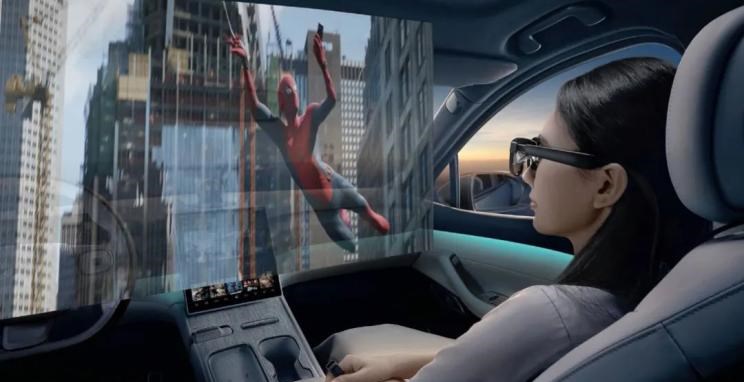 用户可以在眼前的空中巨屏上,以各种姿势实时获取电子设备的显示信息,搭配上蔚来的舒适座舱,在车上就能畅享巨幕影院。