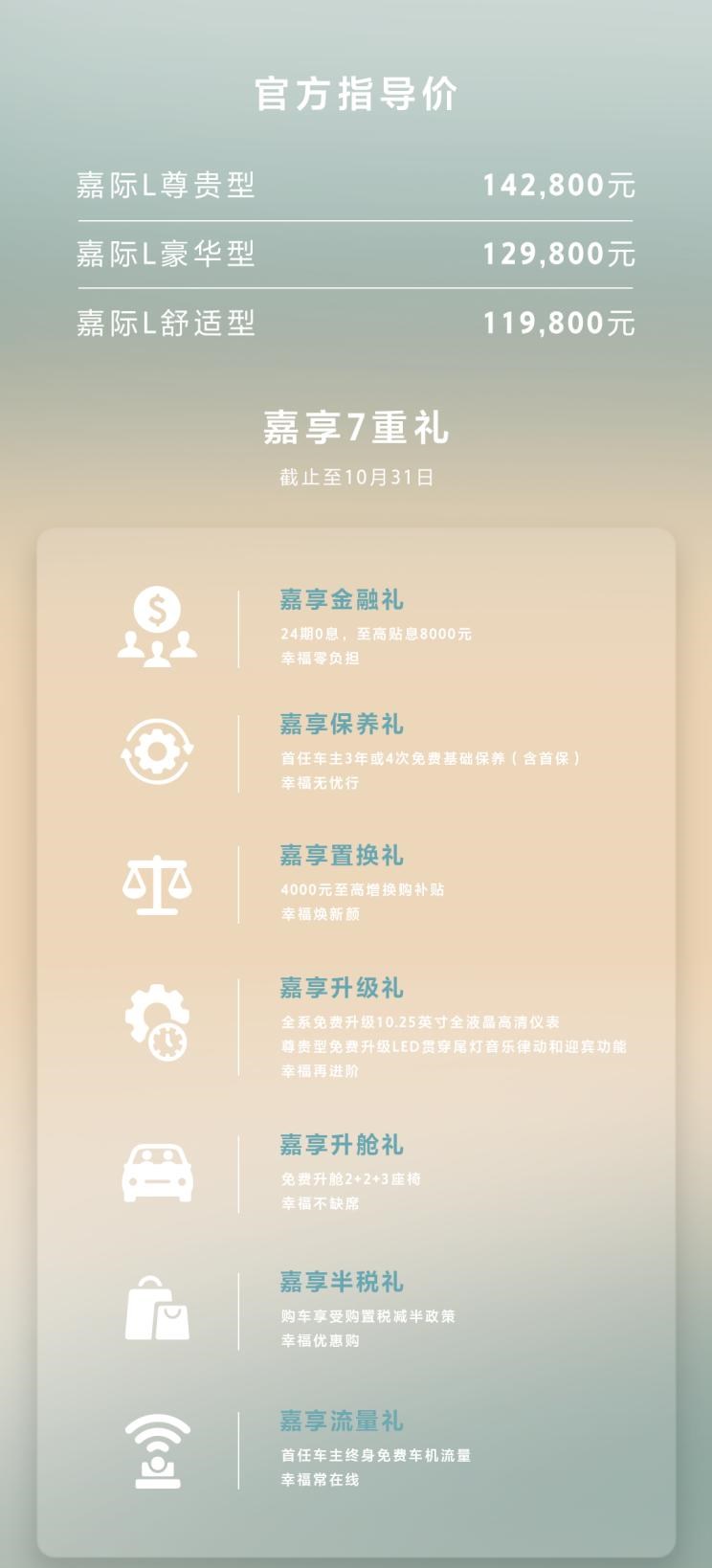 9月3日,吉利汽车正式公布了旗下紧凑型MPV——嘉际L官方指导售价,新车共推出3款配置车型,售价区间为11.98-14.28万元。作为“L”版车型,其车身长度相比现款车型增加120mm,并采用7座布局,提升出行乘坐体验。