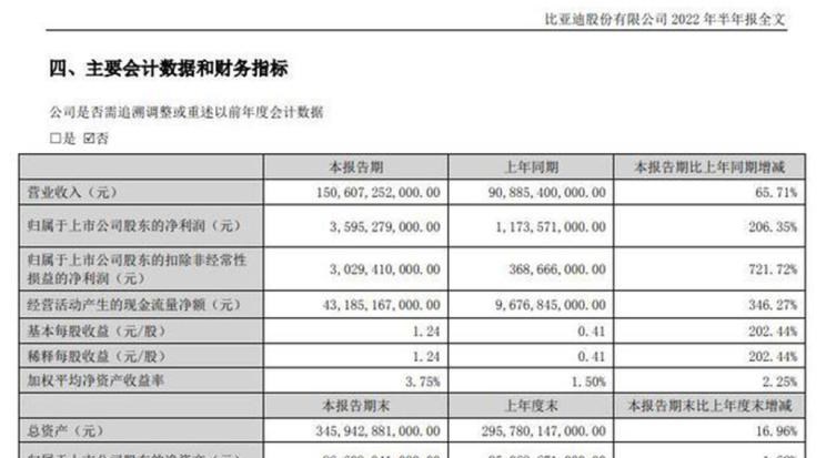 日前,比亚迪发布官方发布了2022年上半年财报。报告显示,比亚迪上半年实现营业收入1506.07亿元,同比增长65.71%;归属于上市公司股东的净利润35.95亿元,同比增长206.35%。