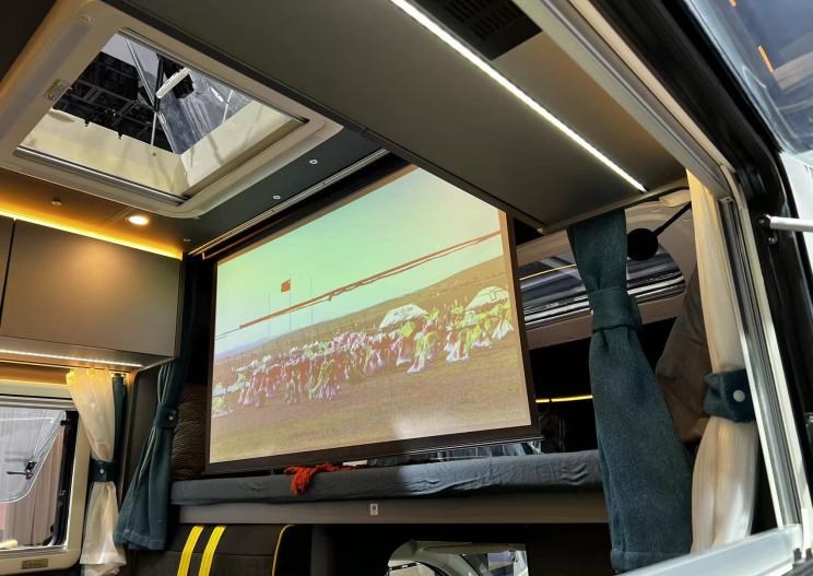 车身厢体结构,进出车的车门改在了车辆的尾部,驾驶舱顶部仍然为车辆的床铺位置,而后部将会是厨房和休息区,车辆的窗户尺寸表现一般,在车辆的车尾还提供了一个拖车钩,可以满足用户携带拖车的需求,同时车尾还有一个备胎。