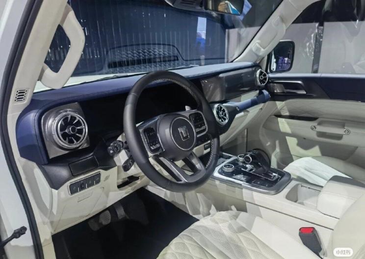 内饰方面,其整体的设计理念遵循硬派越野的风格,大面积的方直轮廓线条搭配圆润的倒角,并采用12.3英寸双联屏等。此外圆型空调出风口和圆形功能旋钮配以方菱形缝线内饰板,搭配起来更有质感,也给人一种饱满硬派的感觉。