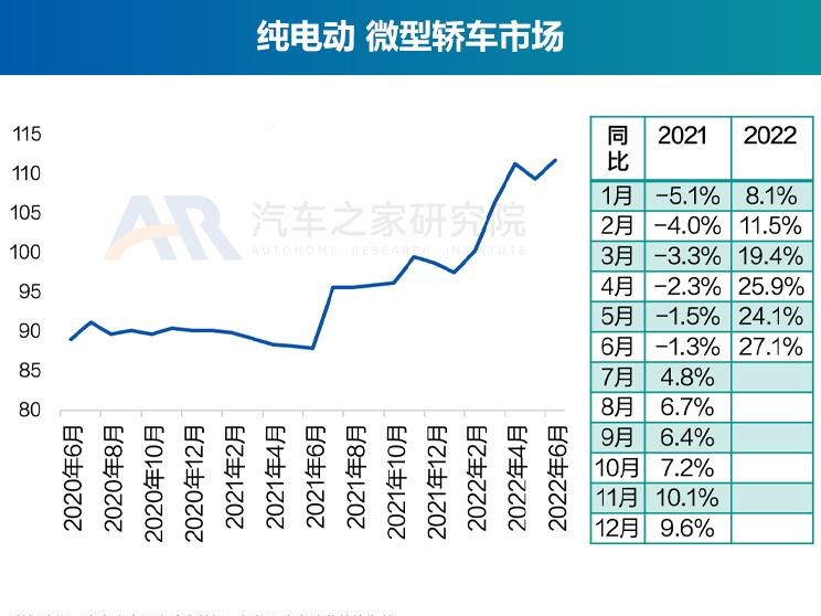 6月,纯电动小型轿车市场的价格指数为104.41,同比增长12.76%,环比增长3.10%,细分市场整体均价为12.19万元,较去年同期涨5200元,较上月涨3700元。其中,涨价车系为欧拉好猫(+9.5%)、海豚(+0.9%)。