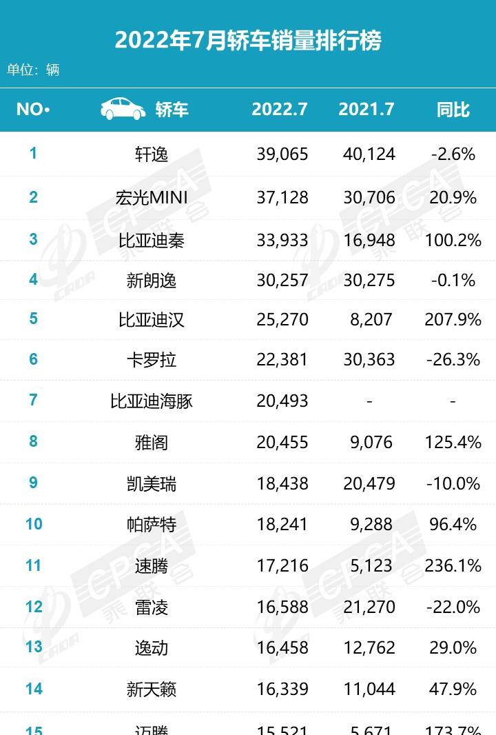 近日,乘联会公布了2022年7月及1-7月轿车销量排行。数据显示,7月份国内狭义乘用车市场销量达181.8万辆,同比下降20.4%,环比下降6.5%;1-7月份累计销量1107.9万辆,同比下降3.5%。轿车方面,7月份共销售90.3万辆,同比上涨24.8%,环比下降8.5%;1-7月销售549万辆,同比下降1.3%。
