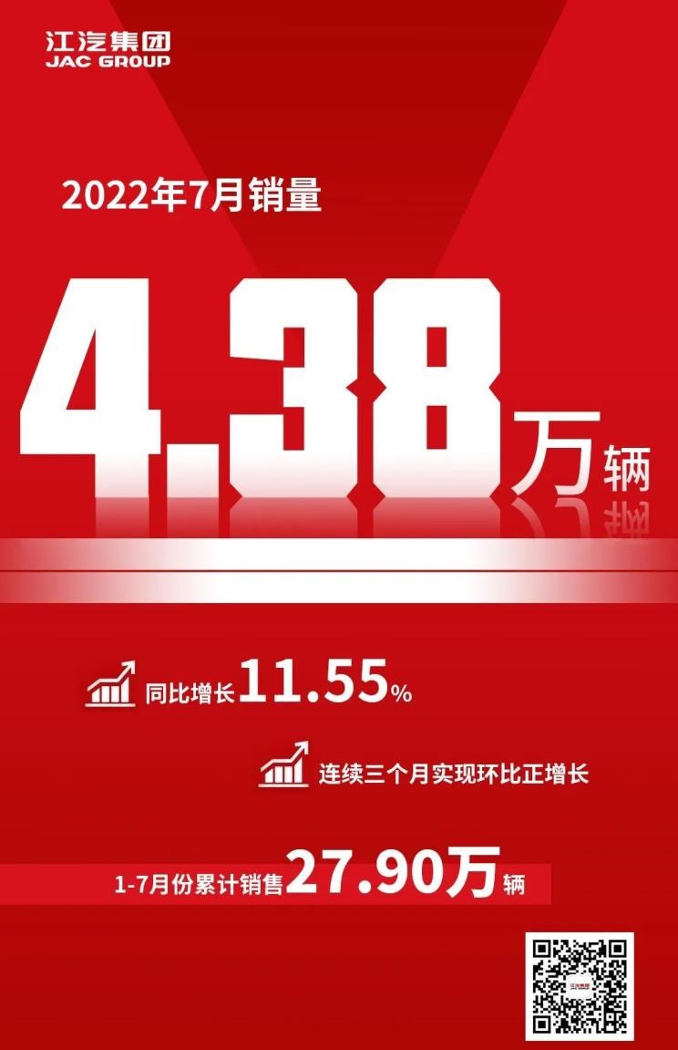 日前,安徽江淮汽车集团股份有限公司发布了7月份的产销成绩。据悉,2022年7月,江汽集团销量为4.38万辆,同比增长11.55%,连续三个月实现环比正增长;1-7月累计销量为27.90万辆。