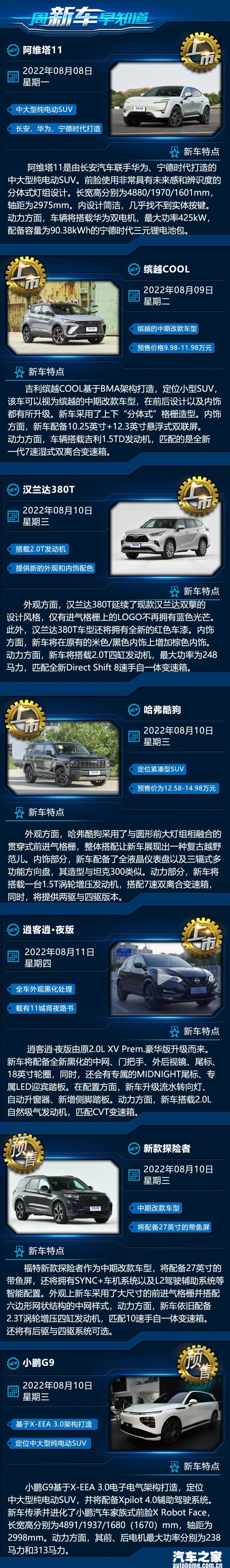 好了,一周新车早知道的新车汇总就到这里了,不知道这其中有没有您中意的车型,如果有的话也请您在它上市或者亮点的当天重点关注下。下周上市的新车不少,主要都是SUV车型,其中阿维塔11(参数|询价)是该品牌的首款产品,而哈弗酷狗,汉兰达380T等都是一些网友关注许久的车型。总的来说,下周不乏一些重磅车型,我们届时也会为大家带来更详细的报导,敬请期待。
