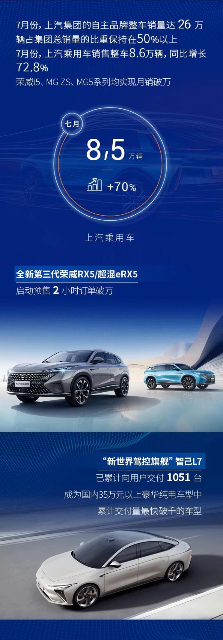 上汽乘用车销售8.6万辆,同比增长72.8%;其中荣威i5(参数|询价)、名爵ZS和名爵5系列均实现月销破万。另外,上汽大众7月销量为13万辆,同比增长85.2%;上汽通用7月销量11.5万辆,同比增长27.8%;上汽通用五菱7月销售14.5万辆,同比增长31.8%。