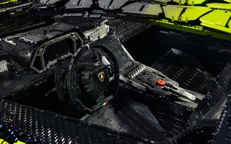 在驾驶舱内部,包括方向盘上的著名兰博基尼盾形标识和意大利国旗,以及仪表控制面板和赛车座椅在内的各处细致细节也通过乐高积木得以呈现。