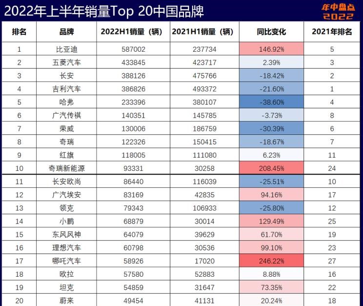 鉴于中国品牌乘用车有100多个品牌,一如既往我们列出这半年的销量Top 20。比亚迪半年销量58.7万辆,同比大涨147%,排名从去年的第5一举跃升至榜首;五菱汽车销量43.39万辆,同比也实现增长,排名前进一个位次至亚军.