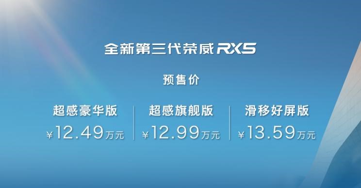 全新荣威RX5/eRX5预售价车型预售价全新荣威RX5超感豪华版12.49超感旗舰版12.99滑移好屏版13.59全新荣威eRX5超混豪华版15.39超混旗舰版15.99超混好屏版16.59 下订可享“8大预售福利”,享受2000元订金翻倍得4000元购车券、888元享价值8888元终身免费基础保养等五大特权,还有机会抽取“13香”手机、至高49999元购车券等三大礼遇。选择全新第三代荣威RX5滑移好屏版、全新第三代荣威超混eRX5超混好屏版的用户,还可免费升级价值3000元的20寸幻影轮圈。
