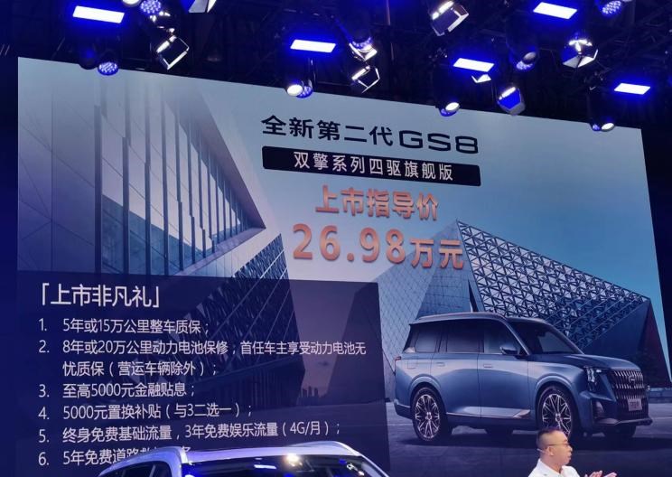 2022年重庆车展上,广汽传祺GS8双擎四驱旗舰版正式上市,新车售价26.98万元,新车搭载2.0TM发动机+增强版THS Ⅱ双电机丰田混合动力系统。