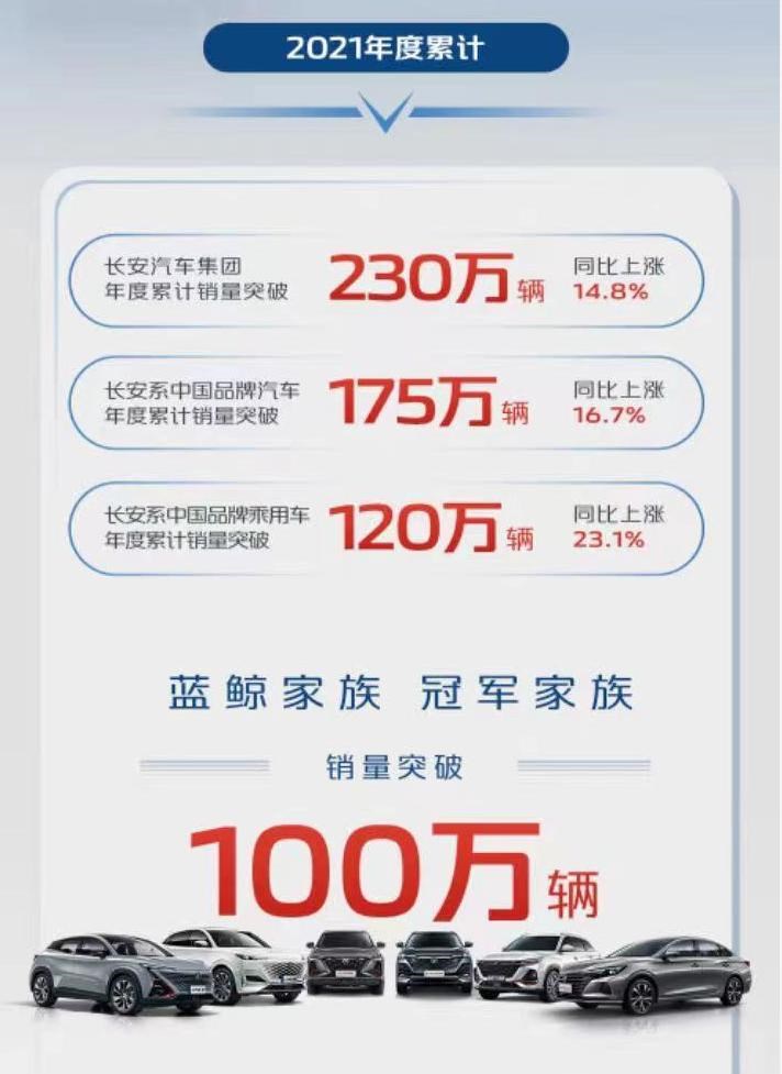 日前,长安汽车公布了2021年的销量成绩,其中,长安汽车集团总销量突破230万辆,同比增长14.8%;长安系中国品牌汽车年度销量突破175万辆,同比增长16.7%,长安系中国品牌乘用车年度销量突破120万辆,同比上涨23.1%。其中,“蓝鲸”家族车型的累计销量表现突破100万辆。