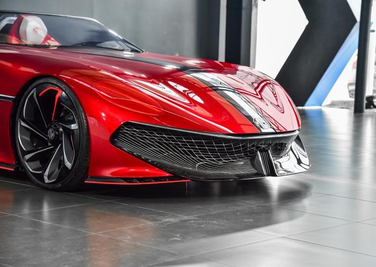 名爵纯电动路试车有着非常厚重的伪装,通过与伪装车一旁的荣威Ei5进行比较,我们可以看到这款全新的电动车高度与荣威Ei5接近,整体造型低矮紧凑,车头底部向前突出的扰流式样以及中央好似“山羊胡”的造型来自概念车Cyberster,运动感十足。