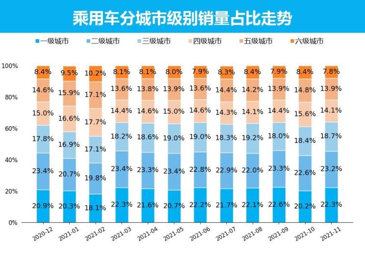 11月乘用车销量最高的城市级别为二级城市,销量为41.8万辆,销量占比为23.2%,比10月增长0.6%;与去年同期相比,下降0.4%,一线城市人口规模大,消费能力强,同时限购政策也导致需求更加平稳。四级城市、五级城市、六级城市销量占比较10月有不同程度的下滑,一级城市、二级城市、三级城市较10月相比实现销量份额的提升。