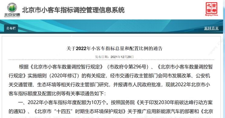 12月29日,北京市小客车指标调控管理信息系统网站发文称,根据《北京市小客车数量调控暂行规定》的有关规定,经市交通行政主管部门会同市发展改革、机关交通管理、生态环境等相关行政主管部门研究,并报请市人民政府批准,现就2022年北京市小客车指标额度及配置比例等有关事项通告如下: