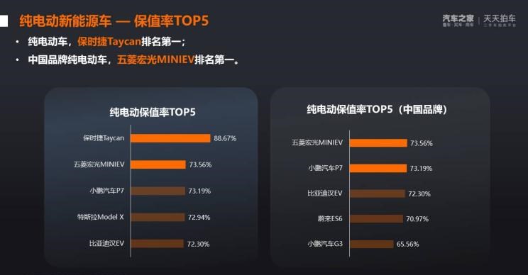 纯电动领域,中国品牌产品线丰富。在10万以下级别的五菱宏光五菱MINIEV、10-20万级别的小鹏G3、20-30万级别的小鹏P7均取得第一。30万以上高价车领域,蔚来ES6以70.97%保值率排名第三。