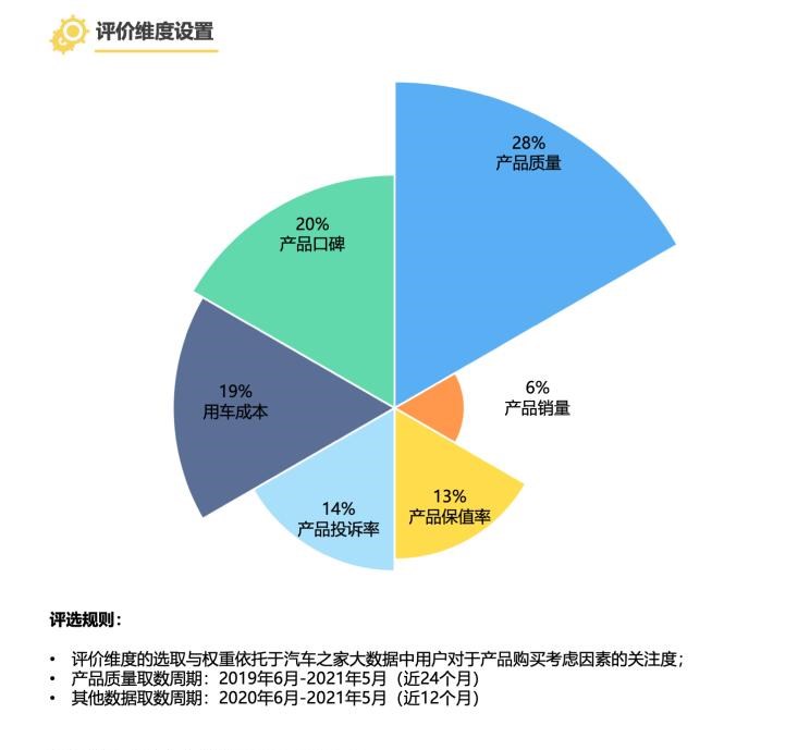评选维度为综合过去一年中,各产品销量情况、产品力及用户评价相关维度的表现进行评价,“信赖”代表消费者对产品的一种肯定。消费者信赖车型的评选维度具体包括6个方面:产品质量。