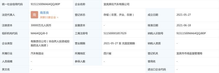 日前,据企查查显示,宜宾英伦汽车有限公司发生工商变更,注册资本由2亿人民币增至3亿人民币,增幅50%。该公司成立于2021年5月,法定代表人为南圣良,经营范围含新能源汽车整车销售;新能源原动设备制造;新能源汽车换电设施销售等。