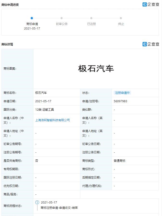 日前,我们从国内企业信息查询网站上获悉,小米生态链公司石头科技关联公司上海洛轲智能科技有限公司申请“极石汽车”商标,国际分类涉及运输工具、科学仪器等,目前商标状态多为“注册申请中”。该公司注册资本1000万元人民币,法定代表人及最大股东为昌敬。