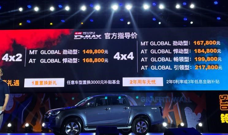 江西五十铃全新D-MAX指导售价车型售价Global 劲动型 4×2 MT14.98Global 悍动型 4×2 AT16.68Global 劲动型 4×4 MT16.78Global 悍动型 4×4 AT18.48Global 畅领型 4×4 AT19.98Global 引领型 4×4 AT21.78 同时,新车还推出了重置换新礼和2年用车无忧等礼遇,消费者使用任意车型置换都可获得3000元补贴,还有2年0利率金融补贴政策。