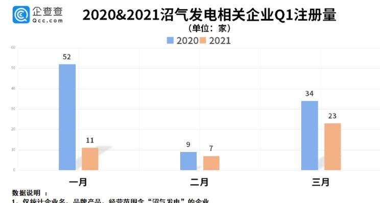 2021年第一季度,我国沼气发电相关企业注册量为41家,同比下降了86.5%。其中,1-3月份注册量分别为11家、7家和23家。