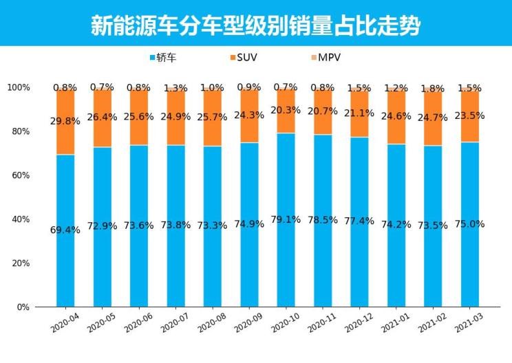 从车型级别销量来看,3月份新能源轿车销量为12.9万辆,销量占比为75.0%,较上个月增长1.5%;与去年同期相比,轿车销量占比上涨0.1%。新能源SUV销量为4.0万辆,销量占比为23.5%,较上个月下滑1.2%;与去年同期相比,SUV销量占比下跌1.0%,SUV整体销量占比有所增长,但不够稳定。新能源MPV销量为0.3万辆,销量占比仅为1.5%,销量占比与上个月下滑0.3%;与去年同期相比,MPV销量占比上涨1.0%。