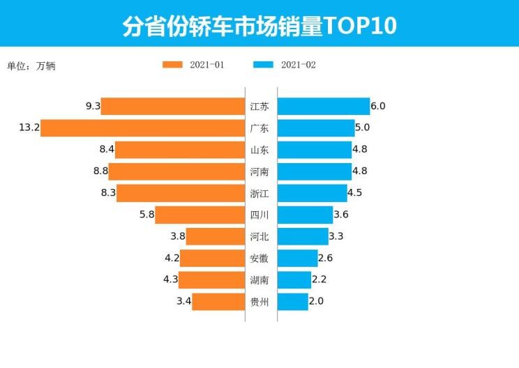 2月轿车销量最高的5个省份为江苏、广东、山东、河南、浙江,销量分别为6.0万辆、5.0万辆、4.8万辆、4.8万辆、4.5万辆,占总销量的41.0%,其中江苏销量占比较1月相比增长1.5个百分点。与1相比,销量上涨幅度最高的三个省分别为河北、江苏、四川,上涨幅度分别为2.1、1.5、0.8个百分点。未来各省份之间的竞争将会更加激烈。
