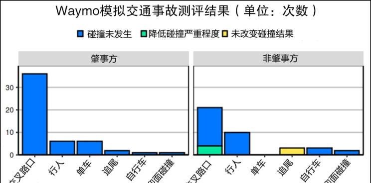 在作为非肇事方的39次模拟中,82%的案例中碰撞被完全规避了;10%的碰撞虽然依然发生了但是因为Waymo Driver采取了相应措施降低了碰撞时的车辆速度,进而降低了事故的严重程度;而在剩余8%的案例中,Waymo Driver并没有带来任何改变,不过这些事故无一例外都是追尾事故,而Waymo Driver则是被追尾一方。