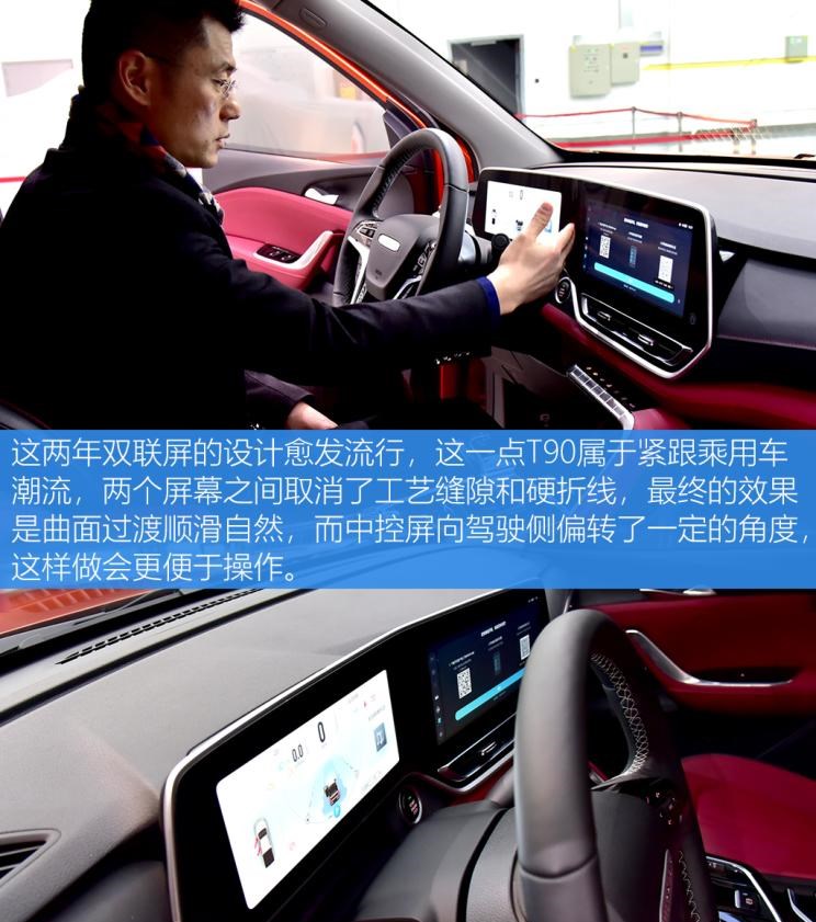 悬架结构方面,T90前后悬架分别为双叉臂式独立悬架和钢板弹簧非独立悬架,与同级别其它皮卡一样承载能力强。驱动形式方面,T90搭载了适时四驱系统,通过按钮可在2H/4H/自动/4L多种模式间切换。越野能力方面,T90有着约22厘米的离地间隙,最大可以爬上100%的坡,有一定的通过性。