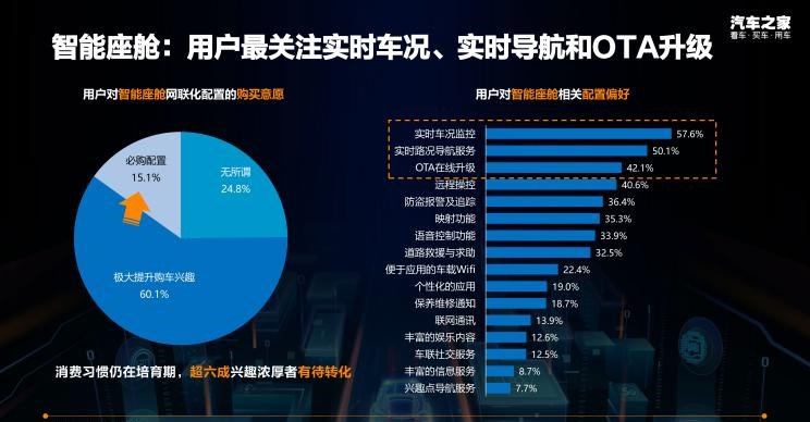 在智能座舱板块,目前用户对智能座舱网联化配置的购买意愿不高,消费习惯仍处在培育期,超6成的购买用户还需要转化。此外,智能座舱的相关配置中,实时车况监控、实时路况导航服务以及OTA在线升级,是用户最为关注的三项配置。