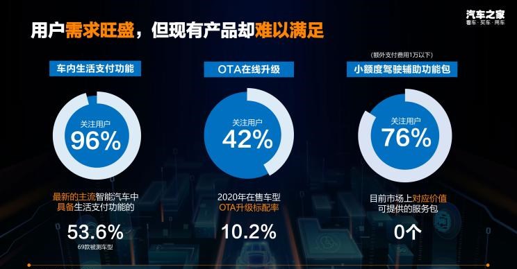 第一,用户需求高,现有产品难以满足。汽车之家大数据显示,超9成用户表示对车内支付有需求,但实际仅有少数的车型能提供相关服务。此外,4成用户有OTA在线升级的需求,当前车型的标配率还较低。而对于小额度驾驶辅助功能包,近8成用户有购买意愿,但预算有限。而且,目前市场上对应价值可提供的服务包数量为零。