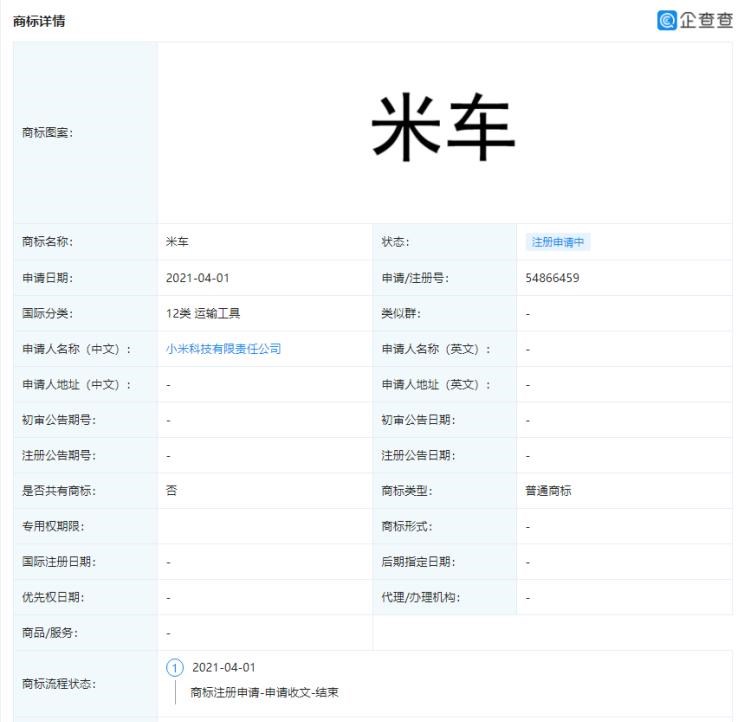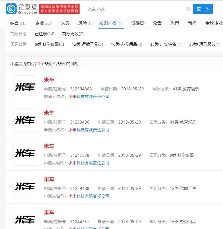 小米宣布造车之后,雷军曾在在线中称,还没想好小米汽车的具体名字,需要再花点时间认真的评估。而有意思的是,根据企查查显示的信息,小米科技有限责任公司在2018年就申请注册了“米车”商标,类别为教育娱乐、科学仪器等,目前已注册成功。