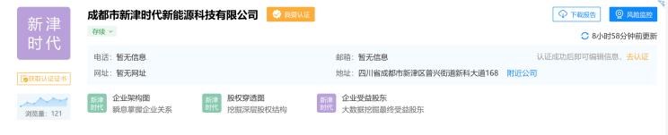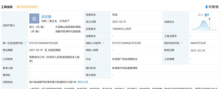 日前,根据天眼查显示,2月1日,成都市新津时代新能源科技有限公司成立,法定代表人为武志强,注册资本10亿元人民币。