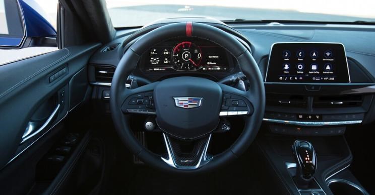 内饰方面,新车整体采用了全黑色的内饰色调搭配,并在车门把手、空调出风口以及挡把周围加以镀铬装饰进行装饰,配合三辐式多功能方向盘,让新车看上去十分年轻。同时,新车中控台采用了多条复合线条进行勾勒,搭配大尺寸中控液晶屏以及多边形空调出风口,进一步提升该车内饰层次感。此外CT5-V Blackwing还将配备碳纤维座椅,并具备加热和通风功能。