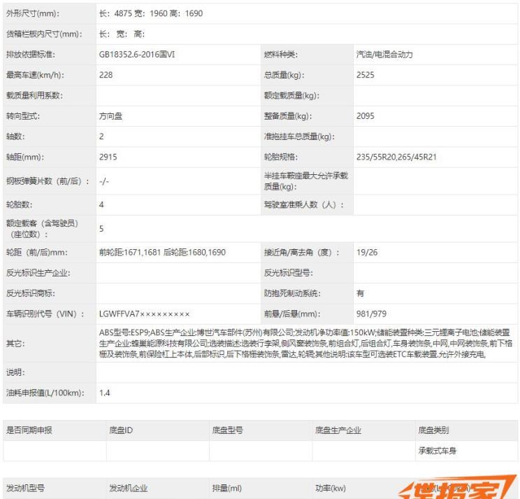 具体参数方面,这款车的长宽高分别为4875/1960/1690mm,轴距为2915mm,相比于现款VV7拥有更大的车身,但是轴距略有缩短。轮胎方面,新车会提供235/55 R20、265/45 R21两种规格。整备质量方面,申报数据为1755kg~2095kg。