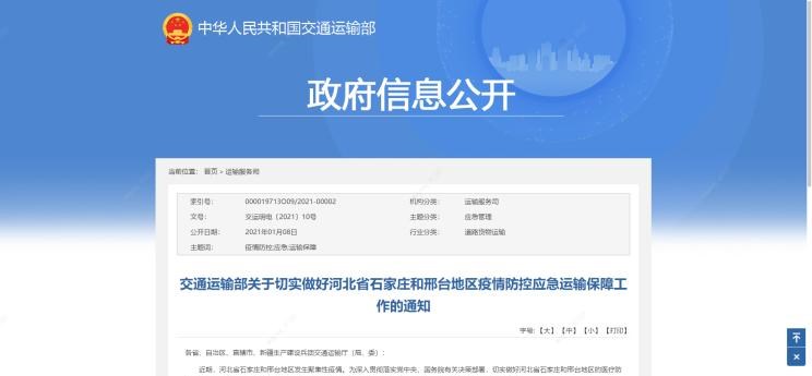 近日,交通运输部印发《关于切实做好河北省石家庄和邢台地区疫情防控应急运输保障工作的通知》,全文如下: