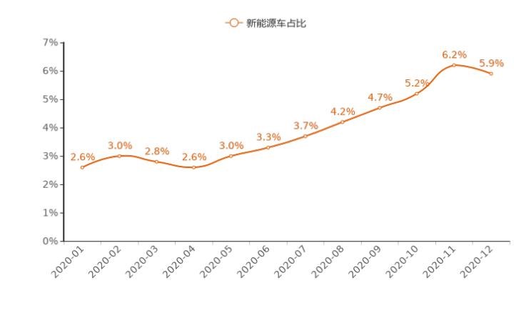 2020年12月,乘用车中新能源车用户购车意向占比为5.9%,相较上月小幅下跌0.3个百分点,用户意向占比触底反弹。在政策的驱动下,新能源车近年迎来较快发展,乘用车市场新能源意向占比不断增长,但在去年12月开始,新能源车用户意向占比开始连续3个月下滑,一方面原因是车企、经销商为扭转市场的低迷,加大了燃油车的营销力度;另一方面是因为补贴退坡导致消费提透支,对购车成本增加的预期使得用户持观望态度。随着车企应对补贴退坡的策略逐渐实施,通过各种营销活动和降价策略让利于消费者,新能源车用户意向占比将会进一步回升。