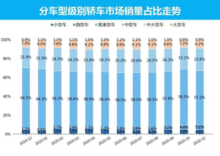 三.轿车各车型级别销量占比走势:用户对紧凑型车、中型车有一定的偏爱