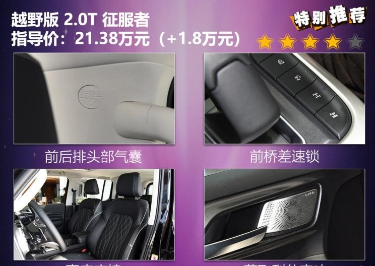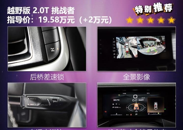 中配2.0T 挑战者是最值得买的车型,贵出来的2万元在越野方面多了后桥差速锁和底盘透视功能,舒适性上也有带加热/按摩功能的皮质座椅、自适应巡航、全景影像等。可以说它既能城市代步、长途出游,又能满足一定的中度越野需求。