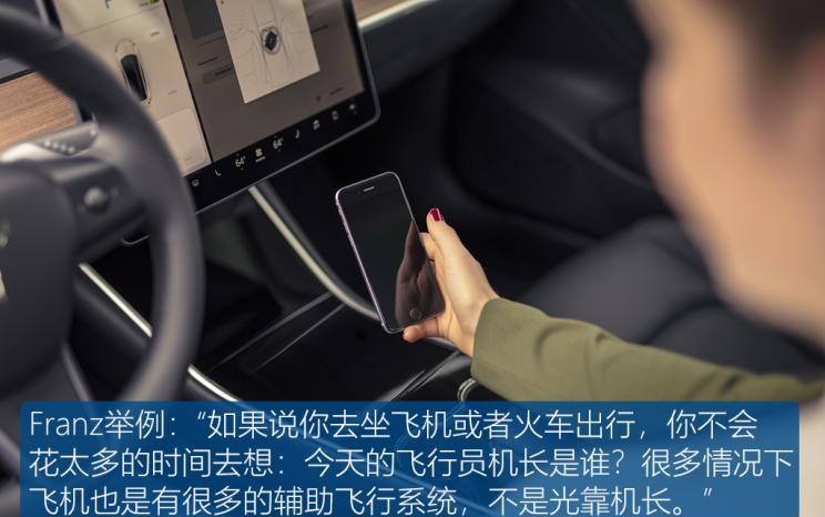 Model 3的设计与自动驾驶技术的紧密联系是Franz在对话中一直提到的,他认为自动驾驶的到来与当时马车时代转向机动车时代一样,会让从A点到B点的效率更高,这会是汽车历史上一次庞大的转型。自动驾驶的成分越来越多,就牵扯到汽车的内饰设计变化,会更多关注在没有开车的时候做什么事,内饰会围绕驾驶员来开发。