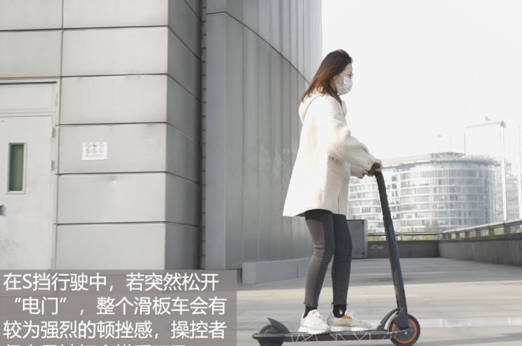 但按照这辆车的启动模式来看,在ECO模式下,电机介入后,其速度还不如脚蹬的初速度快,整个滑板车会逐渐减速,直到维持在7km/h左右,才会保持匀速前进状态;在D挡下,电机介入后,会跟正常力道的脚蹬初速度保持一致,并缓慢的加速到12km/h。值得注意的是,在D挡模式下,若松开“电门”,动力的骤然消失会让体验者感到稍许顿挫感,但并不明显。