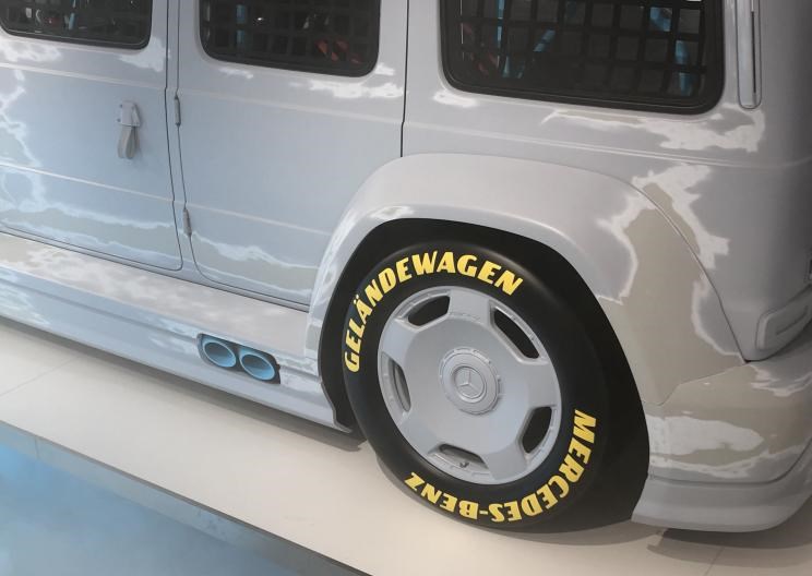 从外观上便能很明显地感受到,Geländewagen项目从赛车上汲取了不少灵感。就外观来说,更低的离地间隙,尺寸宏伟的前后包围、轮眉与侧裙和赛车式样的轮胎等都赋予了G级车型截然不同的形象。为了凸显G级车型标志性的造型与比例,整车采用了纯白的涂漆与手工打磨的效果,看起来令人耳目一新,让我不禁想起了小时候经常把玩的火柴盒小车,特别是那种拥有黄字轮胎的纳斯卡赛车。
