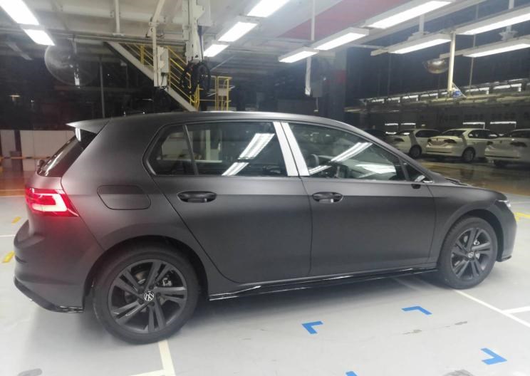 此次曝光的实车是在全新高尔夫的生产线上拍摄的。作为一款个性化定制车型,新车基于R-Line版本打造,但要更加独特。它采用了亚光黑色的外观涂装,车身的所有装饰条也都延续了黑色高亮风格,包含侧裙、前包围、外后视镜等。同时R-Line风格的双五辐式的轮圈也为黑色涂装,整体看上去运动感十足。