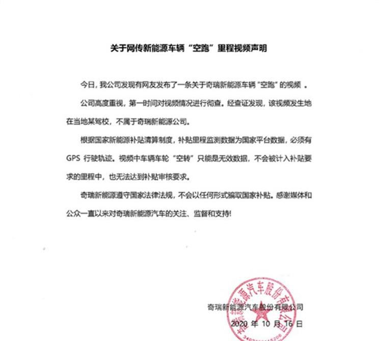 网传“空跑”视频 奇瑞新能源发布声明