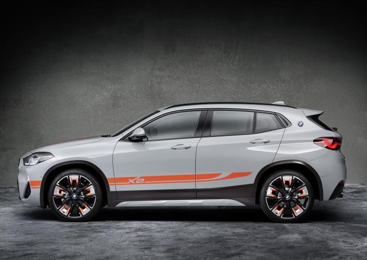外观方面,宝马X2 Edition M Mesh车型在前发动机盖以及车身侧面增加了橙色拉花,轮圈也采用了独特的五辐设计,并增加橙色元素进行点缀。