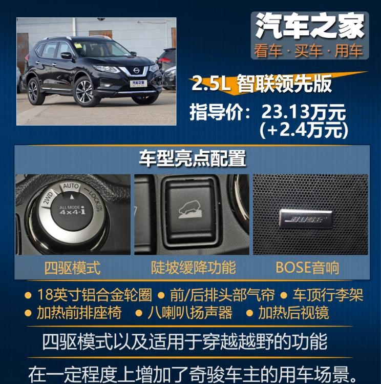 作为2021款奇骏2.5L产品序列中的入门版车型,这款车的配置一点都不低,搭载的2.5L自然吸气发动机相比2.0L发动机在动力方面有明显提升。另外,四驱功能的加入让车辆的通过性上了一个台阶。
