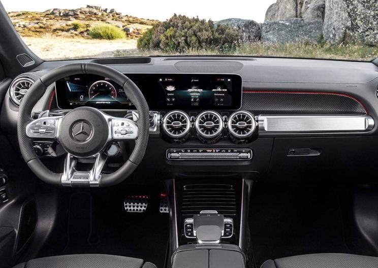 在内饰方面,AMG GLA 35/GLB 35采用相同的家族造型,液晶仪表与中控屏一体式的造型属于较为典型的设计,不过内部融入了碳纤维材质,并在中控台、门板处融入了红色点缀,以增强其运动感。