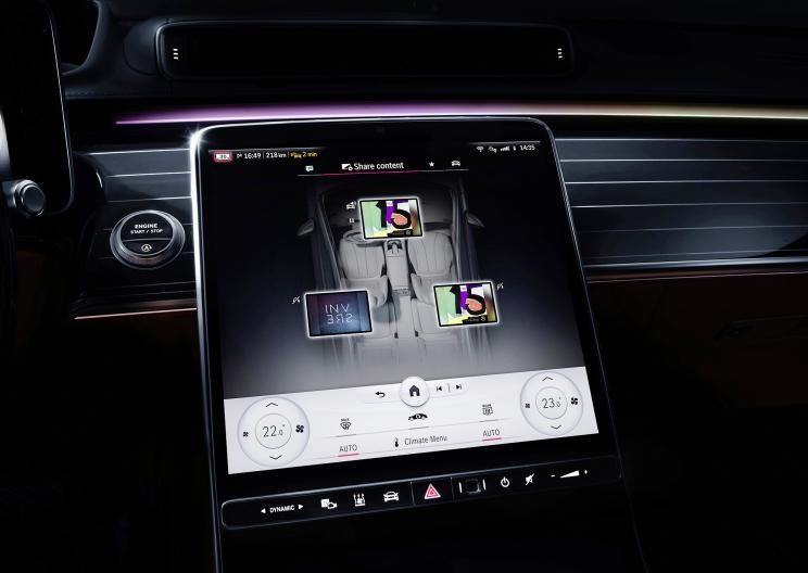 内饰是全新一代S的亮点所在。全新S级的整体设计思路来自豪华游艇上的制造理念,中控台使用了分层式设计,已容纳巨大的AR-HUD抬头显示系统、全液晶仪表盘,以及12.8英寸的OLED中控多媒体触摸屏。新车的前排出风口设计也颇具个性化,中间四连排横向中央出风口与两侧竖直排列出风口相得益彰,配合大面积留白的中控面板,预计会让车主自由发挥选配材料,体现高端的定制化服务。此外,新车还将提供4D的柏林之声音响,包含30个扬声器和8个震荡器,并且每个座椅的律动强度可单独调节。